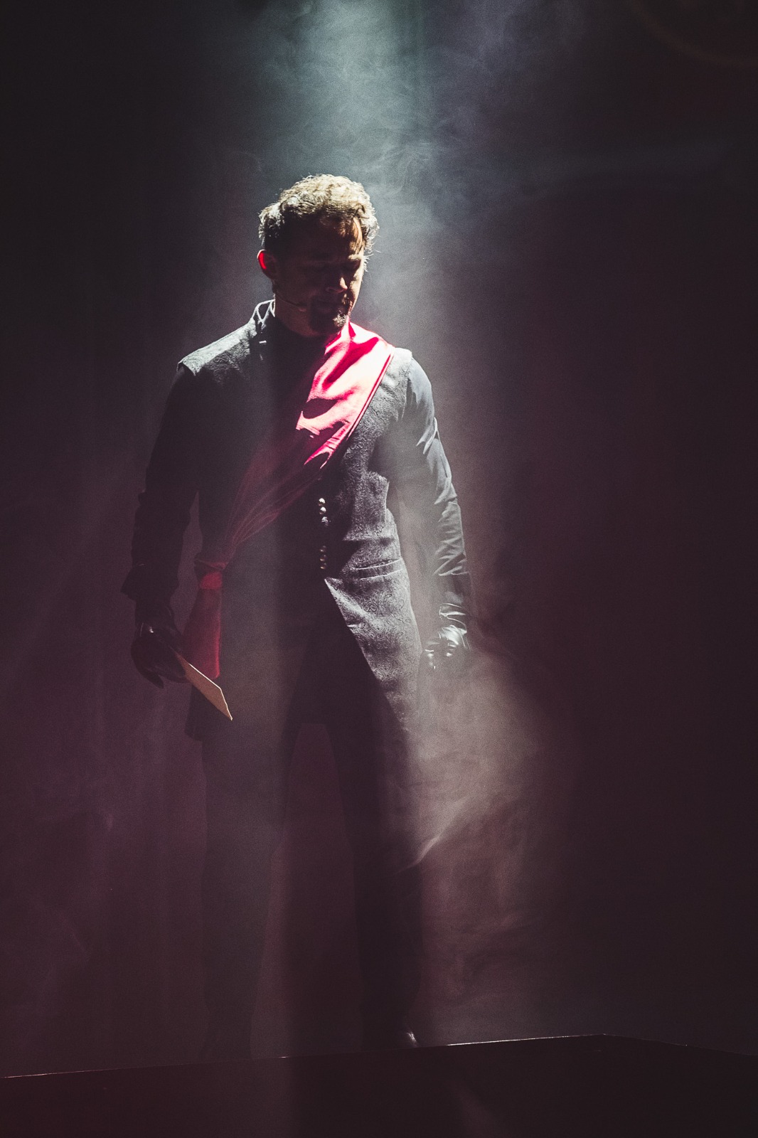 Credo che la bellezza della letteratura è che cambiando punto di vista diventa sempre attuale e il teatro fa da maestro in questo, penso sia la forma d’arte più universale che esista, se oggi leggiamo Shakespeare ci sembra così vivo e contemporaneo che ci dimentichiamo dei suoi oltre 400 anni. Tornando allo spettacolo, è una storia importante e complessa, esplora ogni parte dell’animo umano, dalle cose peggiori a quelle più nobili e probabilmente è questo il suo fascino, non tralascia nulla e lo racconta con estrema schiettezza. Da un punto di vista prettamente tecnico lo spettacolo è sicuramente impegnativo, la parte di prosa è corposa e dinamica mentre quella musicale ampia ed elastica, questo fa si che il cantattore deve padroneggiare egregiamente entrambe.